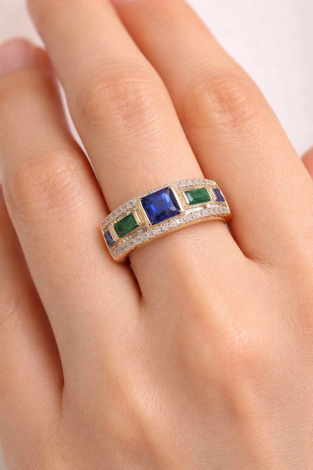 - Bague entourage - couleur émeraude et saphir - Plaqué Or