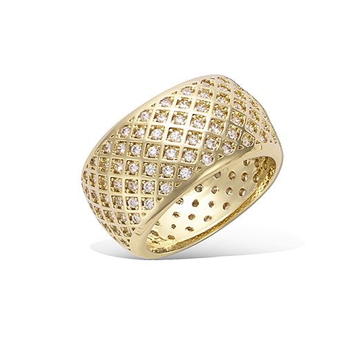 Cette bague large en plaqué or se pare d'un élégant pavé d'oxydes blancs. Son motif géométrique en relief ajoute un caractère raffiné à l'ensemble.