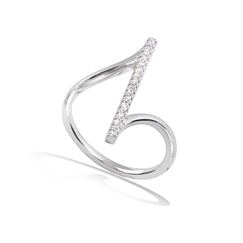 Bague en argent 925 présentant un motif de baguette orné d'oxydes blancs. Sa structure fine et sculpturale met en valeur un pavage de pierres brillantes.