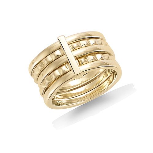 Bague semainier en plaqué or, composée d'anneaux lisses et crantés. Le design offre un jeu de textures et une finition polie qui reflète élégamment la lumière.