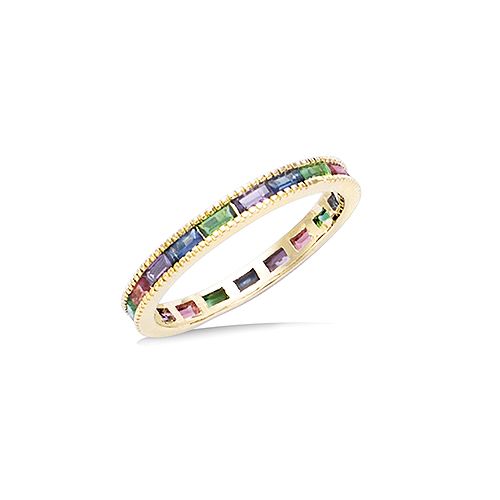 Bague alliance avec serti rail et pierres baguette multicolores.