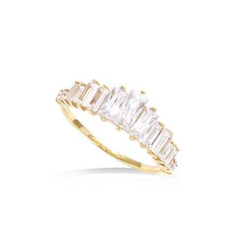 Cette bague en plaqué or est ornée de pierres en forme baguette. Son sertissage délicat met en valeur chaque pierre avec élégance.