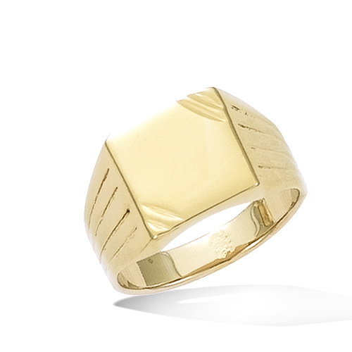 Bague en plaqué or avec un motif carré diamanté. Son design présente des lignes gravées sur les côtés, ajoutant un relief subtil et élégant.