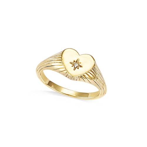 Cette bague en plaqué or présente un motif de cœur lisse rehaussé d'un oxyde de zirconium blanc. La monture met en avant des lignes texturées qui ajoutent du relief au design.
