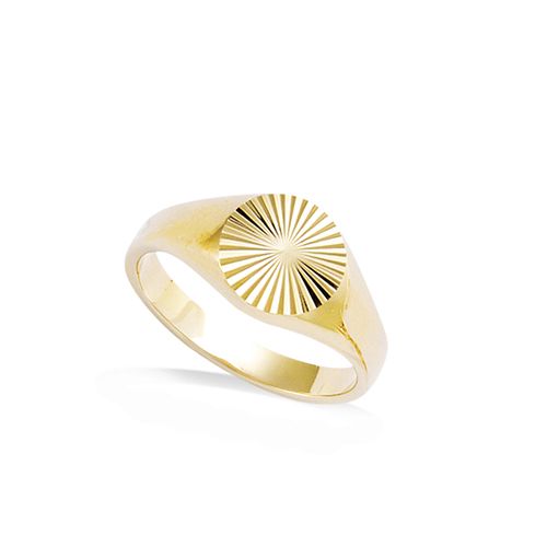 Bague en plaqué or avec un plateau rond diamanté. Le motif présente des lignes rayonnées captant la lumière avec éclat.