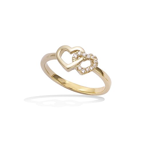 Bague en plaqué or présentant un motif de double cœur orné d'oxydes de zirconium blancs. Les cœurs entrelacés offrent une finition polie, mettant en valeur leur éclat et leur élégance.