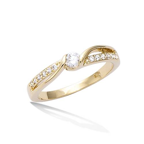 Bague en plaqué or ornée d'un solitaire croisé avec des oxydes blancs. Ses courbes élégantes sont rehaussées par un délicat pavage de pierres brillantes.