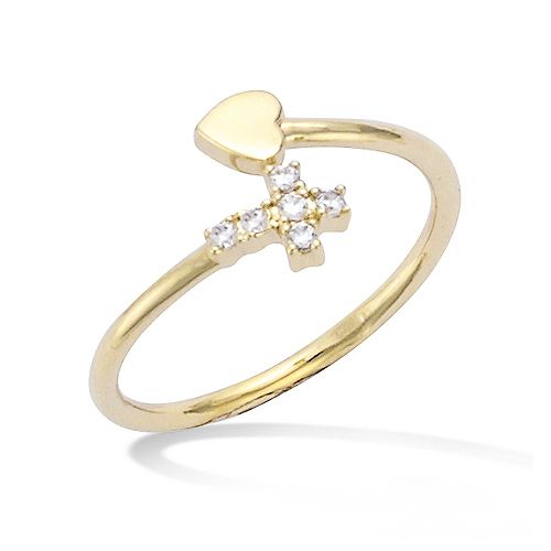 Bague au motif croix et cœur, en plaqué or et ornée d'oxydes de zirconium blancs. Les pierres brillantes mettent en valeur la délicatesse du motif, offrant une harmonie élégante.