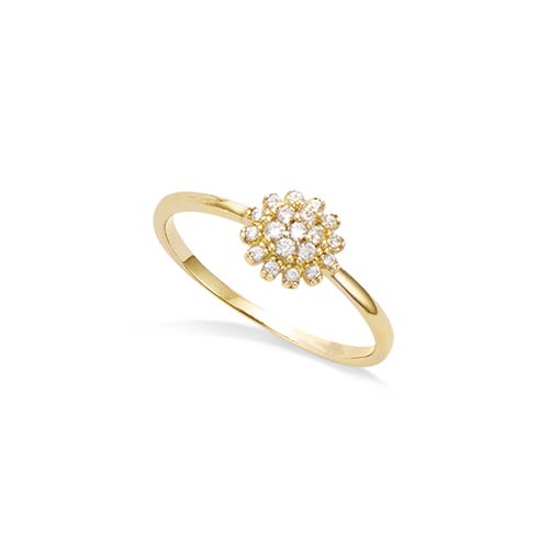 Cette bague en plaqué or présente un élégant motif en forme de fleur agrémenté d'oxydes de zirconium. Les pierres sont harmonieusement disposées, créant un éclat captivant sous la lumière.