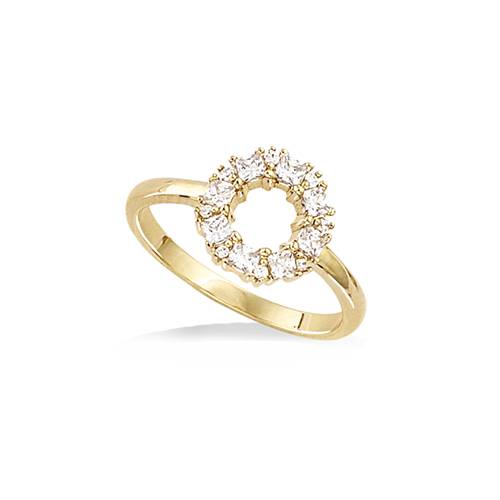 Bague en plaqué or dotée d'un cercle évidé, ornée d'oxydes de zirconium. Les griffes délicates subliment chaque pierre avec éclat.