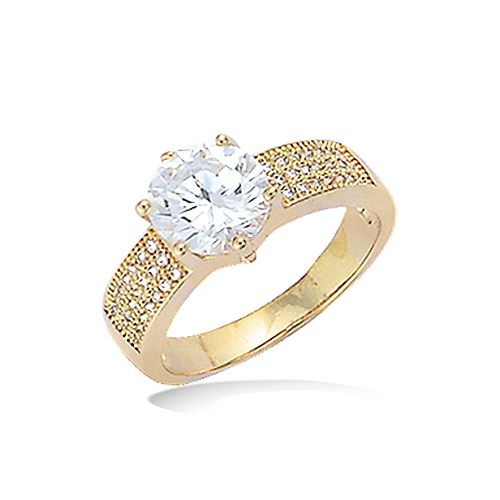 Bague solitaire en plaqué or ornée d'un oxydes de zirconium central serti griffes. La monture présente un pavage sophistiqué d'oxydes, offrant un éclat remarquable.