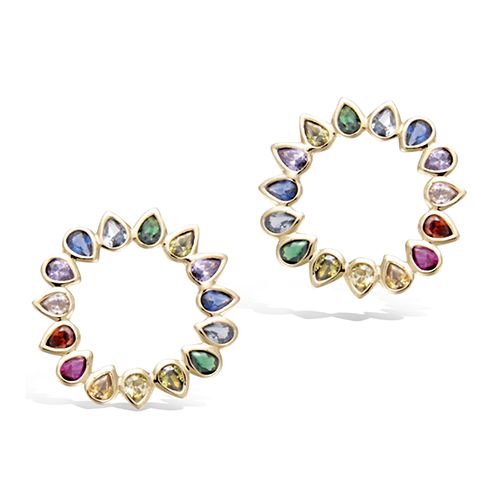 Ces boucles d’oreilles en forme de cercle sont en plaqué or et ornées de pierres multicolores. Les pierres en forme de goutte sont harmonieusement disposées, créant un effet lumineux et vibrant.