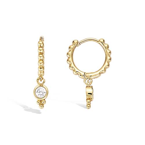 Boucles d’oreilles créoles en plaqué or ornées d'une goutte et d'oxydes de zirconium. Le design raffiné présente des détails structurés qui mettent en valeur l'éclat des pierres.