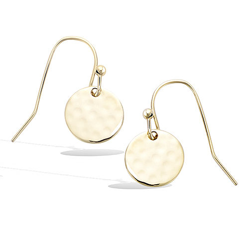 Boucles d’oreilles en plaqué or avec des pastilles martelées. Leur texture unique de 10 mm de diamètre capte la lumière de manière éclatante.