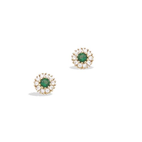 Boucles d’oreilles en plaqué or mettant en valeur des pastilles vertes émeraude entourées d'oxydes de zirconium. Le pavage délicat souligne l'éclat des motifs ronds, ajoutant une touche d'élégance.