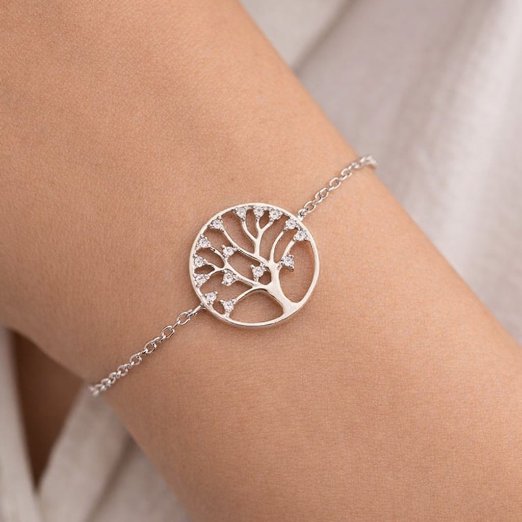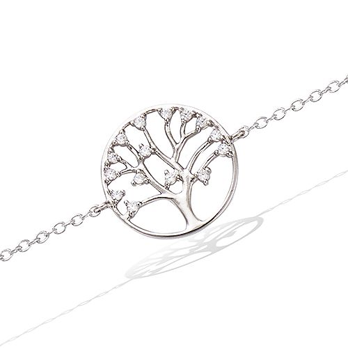 Ce bracelet en argent 925 présente un élégant motif arbre de vie orné d'oxydes de zirconium. Sa structure délicate et sa finition rhodiée mettent en valeur les détails du design.