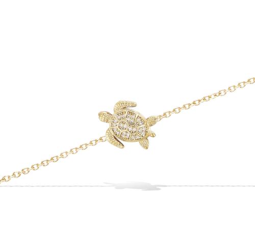 Bracelet en plaqué or représentant une tortue, orné d'oxydes de zirconium blancs. Le motif délicat présente des détails ajourés et un pavage étincelant, accentuant la lumière et la brillance.