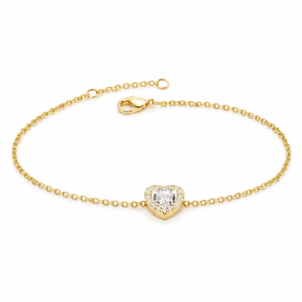 Bracelet en plaqué or avec un cœur solitaire entouré d'oxydes de zirconium. Son design délicat met en valeur un pavage harmonieux de pierres brillantes.