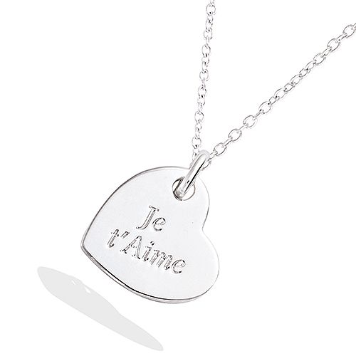 Collier en argent 925 avec un pendentif en forme de cœur gravé 'Je t'aime'. Sa chaîne fine et sa finition lisse soulignent l'élégance de ce bijou intemporel.