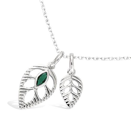Collier en argent avec une forme de double feuilles évidées, de couleur vert émeraude.