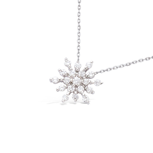 Collier en argent 925 en forme de fleur, orné d'oxydes de zirconium blancs. Le motif floral présente une structure asymétrique avec des détails brillants des pierres.