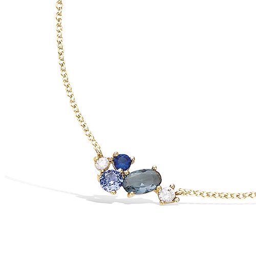 Ce collier en plaqué or présente un motif cluster orné d'oxydes de zirconium dans des tons de bleu. Les pierres de différentes formes sont délicatement serties pour un éclat optimal.