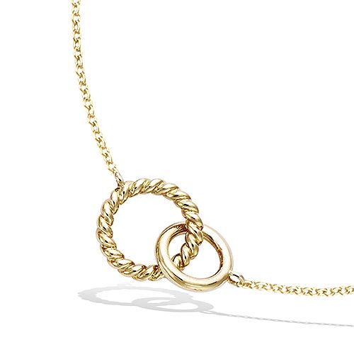 Ce collier présente des anneaux entremêlés en plaqué or. Sa structure lisse et torsadée crée un effet visuel subtil et raffiné.