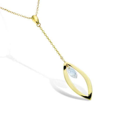 Ce collier en plaqué or arbore un élégant motif en forme d'amande, orné d'un oxyde de zirconium blanc facetté. La structure délicate du bijou met en valeur les lignes douces du motif, créant un éclat subtil.
