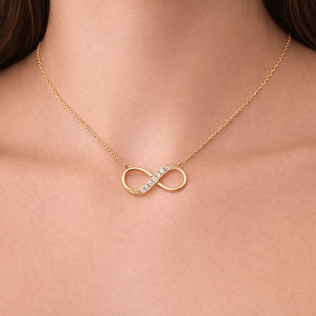 Collier en plaqué or représentant un symbole infini orné d'oxydes de zirconium. Ce bijou arbore des courbes fluides et des pierres scintillantes, créant un effet lumineux et élégant.