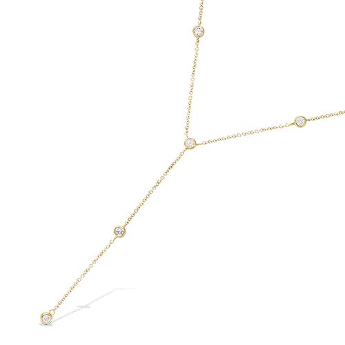 Collier en forme Y en plaqué or, orné d'oxydes de zirconium blancs en serti clos. Les pierres sont disposées avec soin, offrant un éclat sobre et raffiné.
