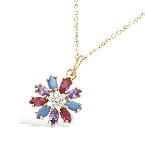 Pendentif en forme de fleur, réalisé en plaqué or, orné de pierres synthétiques turquoise et fuchsia. La composition révèle un motif floral aux pétales délicatement disposés autour d'un centre lumineux d'oxydes de zirconium.