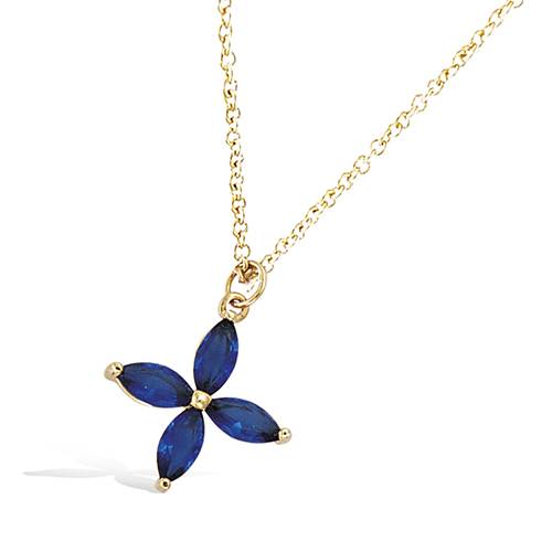 Pendentif en plaqué or au motif de fleur orné d'oxydes de zirconium de couleur bleu saphir. La délicatesse de sa composition accentue les lignes raffinées de chaque pétale.