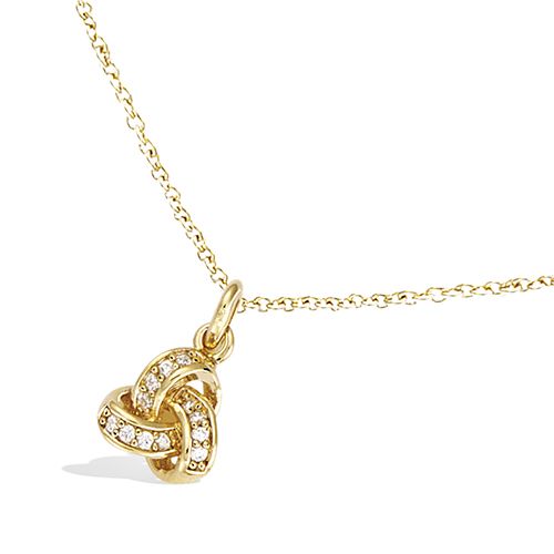 Pendentif en plaqué or en forme de noeud, orné d'oxydes de zirconium blancs. Le design délicat met en valeur un pavage lumineux de pierres scintillantes.