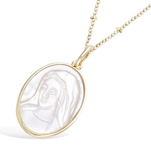 Pendentif en plaqué or de forme ovale, mettant en avant un motif délicat de Vierge Marie en nacre. La surface lumineuse révèle les détails du motif sculpté avec élégance.