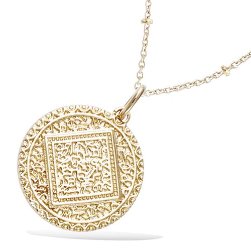 Pendentif en forme ronde en plaqué or, arborant un motif bohème délicatement travaillé. Ses détails texturés et ajourés ajoutent une dimension unique à cette création lumineuse.